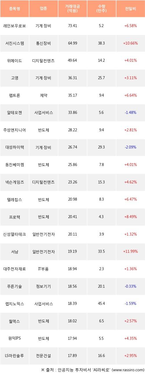 레인보우로보틱스, 서진시스템, 위메이드 등은 전일 대비 주가가 상승했고, 알테오젠, 대성하이텍, 푸른기술 등은 주가가 하락했다.