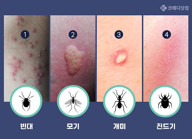 답은 ①번. 빈대 물린 것으로 착각하는 다른 해충은 모기, 개미, 진드기가 있어. 위 이미지에서 물린 증상 자국의 정체는 차례대로 ①빈대 ②모기 ③개미 ④진드기야.