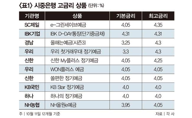 10월 11일 기준 최고금리를 주는 상품은 SC제일은행의 'e-그린세이브예금'이다(표1 참조). 온라인으로만 가입 가능한 1~12개월 정기예금으로, 12개월 기준 기본금리 4.05%에 우대금리를 더해 최고 4.35%를 제공한다. 우대금리는 가입 기간 1년·신규 금액 1000만 원 이하·만기 해약 충족 시 0.1%, 순신규 고객 0.2%다. 가입 금액은 100만 원 이상 10억 원 이하다.