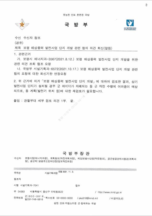18일 국회 산업통상자원중소벤처기업위원회 한무경(국민의힘) 의원에 따르면, 국방부는 2021년 11월 보령시장 등에게 보낸 ‘보령 해상풍력 발전사업 단지 개발 관련 협의 의견서’(사진)에서 “상기 단지가 설치될 경우 군 레이더가 차폐되는 등 군 작전 수행에 어려움이 예상되므로 발전기 위치 등 계획에 대한 재검토가 필요하다”고 밝혔다. 국방부는 당시 신안, 부산 등 다른 풍력발전의 경우 ‘조건부 동의’를 나타내면서도 보령 해상풍력 단지에 대해서만 ‘부동의’ 의견을 제시했다. 국방부는 관할부대 세부 검토 의견도 첨부했다. 해군 2함대사령부는 “해상감시 레이더에 근접해 위치한 발전단지 1구역 및 4구역은 선박탐지 보장을 위해 레이더로부터 이격해 위치 조정이 필요하다”고 우려했다.