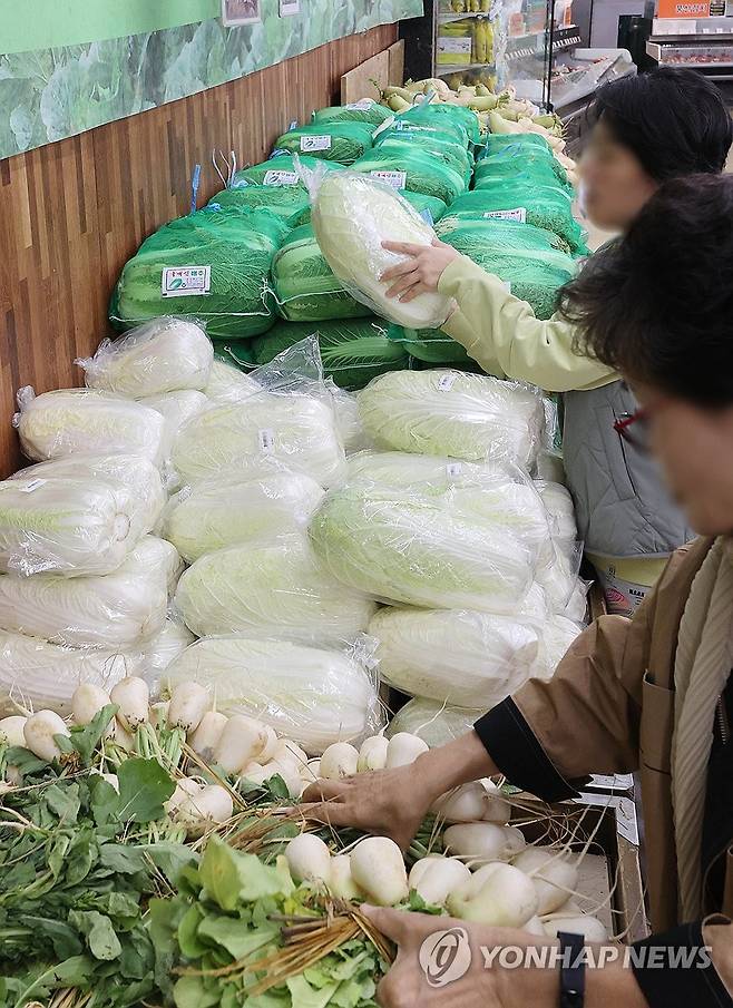 (서울=연합뉴스) 이재희 기자 = 한국농수산식품유통공사(aT) 농산물유통정보에 따르면 17일 배추(상품) 소매가격은 한 포기에 평균 6천587원으로 한 달 전의 5천476원보다 20.3% 올랐다. 1년 전의 5천934원과 비교해도 11.0% 비싸고, 평년(5천432원)보다 21.3% 높다. 사진은 18일 서울 한 대형마트에 진열된 배추. 2023.10.18