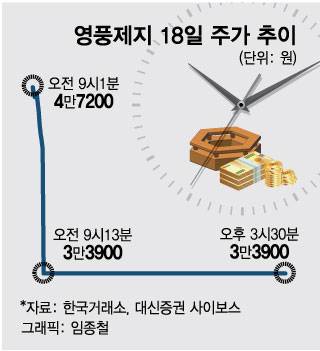 18일 영풍제지는 전일대비 1만4500원(29.96%) 급락한 3만3900원을 기록했다. 개장 초반 1%대 약세를 유지하다 9시13분께 급격히 하한가로 추락했다. 이날 외국인이 1700여주, 기관이 50주 가량 순매도했고 개인은 2100여주 순매수했다.