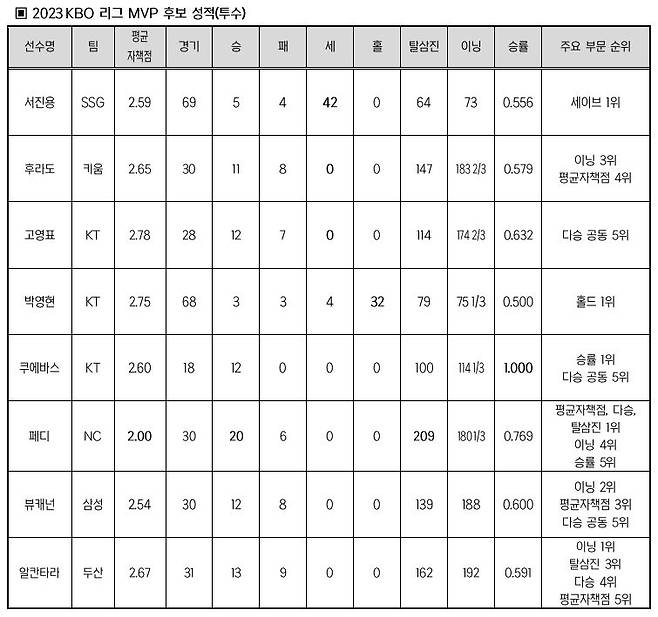 올 시즌 최고의 활약을 펼친 MVP 후보로는 리그 부문별 타이틀홀더 및 우수한 성적을 올린 16명이 선정됐다. 투수의 경우 SSG 서진용을 비롯해 키움 아리엘 후라도, KT 고영표, 박영현, 윌리엄 쿠에바스, NC 에릭 페디, 삼성 데이비드 뷰캐넌, 두산 라울 알칸타라 등 총 8명이 선정됐다. 야수로는 SSG 최정, 키움 김혜성, LG 오스틴 딘, 홍창기, NC 손아섭, 삼성 구자욱, 두산 정수빈, 한화 노시환이 최종 후보로 이름을 올렸다.