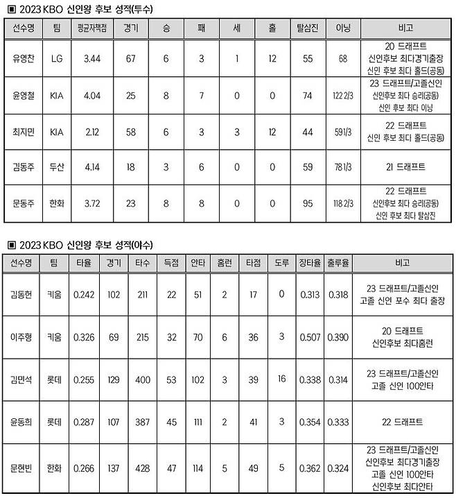 또한 LG 유영찬, KIA 윤영철, 최지민, 두산 김동주, 한화 문동주(이상 투수), 키움 김동헌, 이주형, 롯데 김민석, 윤동희, 한화 문현빈(이상 야수) 등 총 10명의 선수가 신인왕 경쟁에 도전장을 내밀었다.