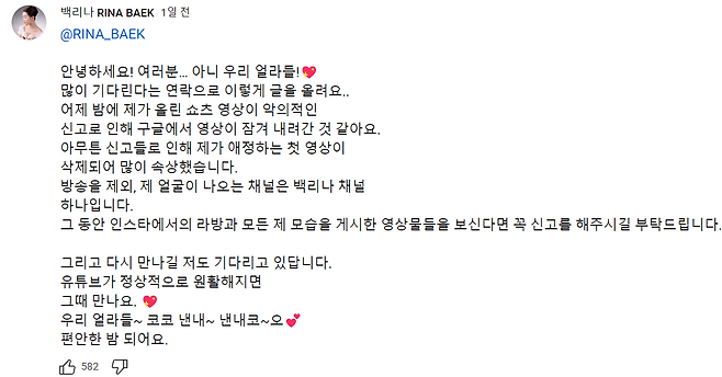 커뮤니티를 통해서는 "어제 밤에 제가 올린 쇼츠 영상이 악의적인 신고로 인해 구글에서 영상이 잠겨 내려간 것 같아요"라며 "아무튼 신고들로 인해 제가 애정 하는 첫 영상이 삭제되어 많이 속상했습니다"라며 심경을 전했다.