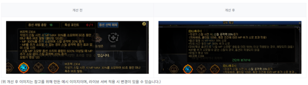이외에 제작 숙련 제거, 다른 채널에서도 친구 파티 초대 및 참여 가능 기능, 일일 미션 변경 시 계정 금고 골드 사용, 사이버틱 스피드 부츠 조건 표시, 융합 UI 개선, 게임패드 던전 버프 사용 추가 등이 거론됐다.