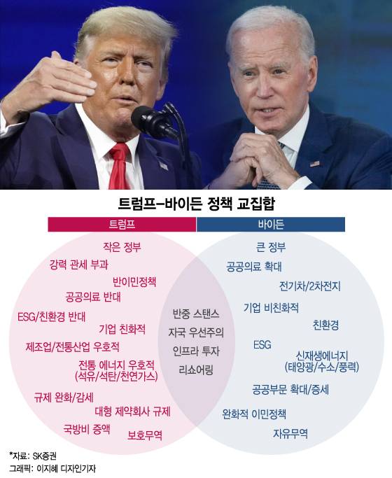 증권가에서는 자국 우선주의, 반중 스탠스 등 바이든 대통령과 트럼프 전 대통령 공약이 겹치는 종목을 공약해보라고 조언했다. 하인환 KB증권 연구원은 "지금 지지율이 높다고 해서 1년 뒤에 당선을 보장하지 않는다"며 "누가 당선되더라도 변함이 없을 종목을 찾아야 한다"고 말했다.