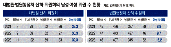 법원행정처 산하 위원회의 경우 30%선도 지켜지지 않았다. 올해 46개 위원회에 참여하는 407명 위원 중 여성은 62명으로 15.2%에 불과했다. 그나마 개선된 것이다. 2021년에는 45개 위원회의 436명 위원 중 여성이 39명(8.9%)이었고, 지난해에는 47개 위원회의 위원 473명 중 여성이 46명(9.7%)이었다.