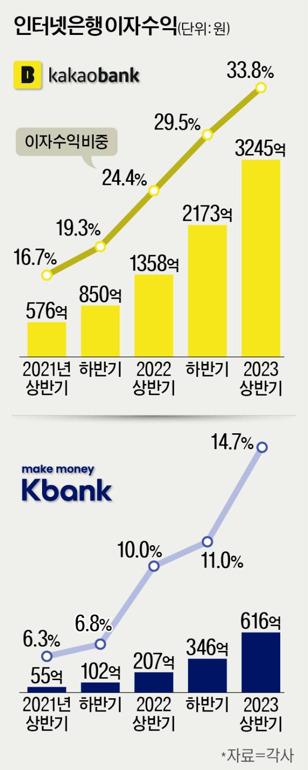 인터넷은행의 주담대 잔액이 빠른 속도로 뛰면서 이자수익 비중도 증가하는 추세다. 인터넷은행의 주담대 잔액은 2020년 말 4조7000억원에서 2021년 말 10조3000억원, 2022년 말 15조6000억원, 올해 9월 말 24조1000억원으로 증가했다. 인터넷은행의 주담대는 최근 1년 새 65% 급증했다.