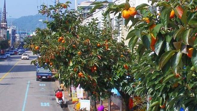 해마다 이맘때면 시가지와 외곽의 도로를 따라 빼곡히 늘어선 감 가로수에 어른 주먹 크기의 연주황빛 감이 주렁주렁 매달려 장관을 이룹니다.