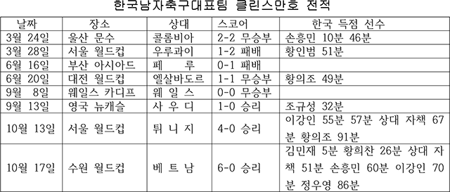 하지만 이후 한국 축구는 세계 랭킹이 낮은 팀만 골라 평가전이나 친선경기를 가져 3승 2무를 달리고 있다. 6월 20일의 엘살바도르(세계 75위)와 1대1, 9월 8일의 웨일스(세계 35위)와 0대0 무승부를 이루었고, 9월 13일에는 사우디(세계 54위)에 1대0 승리, 10월 13일에는 튀니지(세계 29위)에 4대0으로 이겨 17일 베트남 경기까지 5경기 연속 무실점 무패를 기록 중이다.