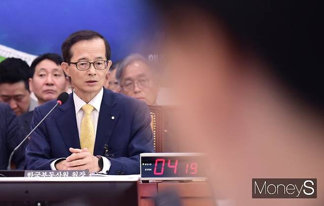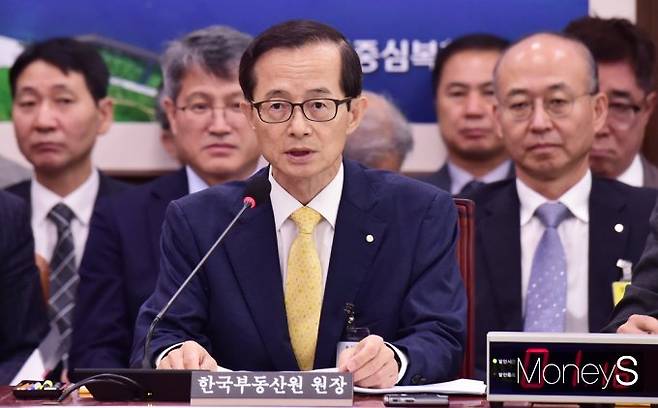 손태락 부동산원장이 19일 서울 여의도 국회 본관 529호에서 진행된 2023 한국부동산원-주택도시보증공사-제주국제자유도시개발선테 등 국정감사에 출석, 질의에 답변하고 있다.