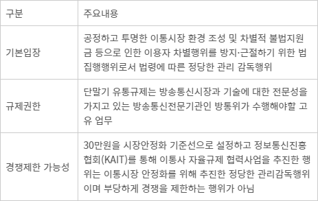 방통위는 “단말기 유통규제는 방송통신시장과 기술에 대한 전문성을 가지고 있는 방송통신전문기관인 방통위가 수행해야할 고유 업무”라는 입장을 표시했다. 방통위는 “30만원을 시장안정화 기준선으로 설정하고 정보통신진흥협회(KAIT)를 통해 이통사 자율규제 협력사업을 추진한 행위는 이통시장 안정화를 위해 추진한 정당한 관리감독행위”라며 “부당하게 경쟁을 제한하는 행위가 아니다”는 입장을 명확히했다.