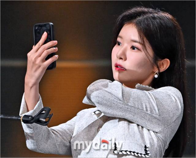 행사 전 무대에 올라 커피를 마시며 진행 대본을 확인하며 여배우 못지않는 아름다움을 선보였다.