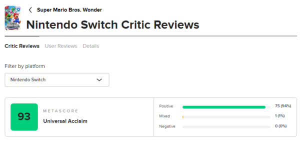 닌텐도 신작 '슈퍼 마리오브라더스 원더'가 메타크리틱 93점을 기록하며 머스트 플레이를 따냈다.