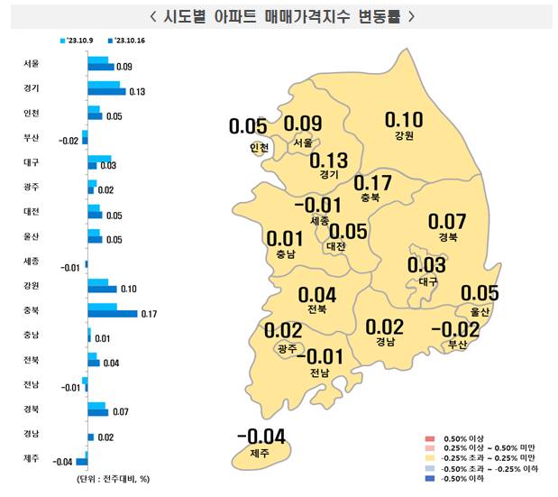한편 같은 기간 전국 아파트값은 0.07%, 수도권은 0.11%를 나타냈다. 지방은 지난주와 동일한 0.03% 상승을 유지했다. 전국 시도 가운데 가장 먼저 반등했던 세종은 -0.01%를 기록, 31주 만에 하락 전환했다.