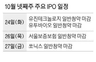 10월 넷째주에는 파두, 두산로보틱스에 이은 올해 세 번째 조 단위 '대어' 서울보증보험을 필두로 쏘닉스, 유투바이오, 유진테크놀로지 등 다수의 기업이 수요예측을 마치고 일반투자자 대상 공모주 청약에 돌입한다.