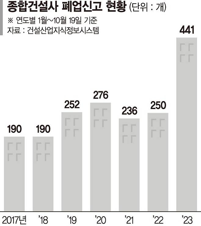 19일 건설산업지식정보시스템에 따르면 올 들어 이날 현재까지 폐업신고를 한 종합건설사는 총 441개사로 집계됐다. 이는 전년동기(250곳) 대비 두배 가까이 늘어난 규모다. 지난 2006년(478개사) 이래 17년 만에 최대치다.