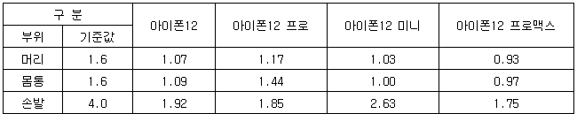 [표] 아이폰 12 시리즈 전자파 인체 흡수율 측정 결과(단위: W/㎏)