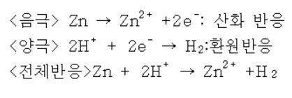 이때 전자를 잃은 아연은 아연 이온(Zn2+)이 되어 금속판에서 빠져나와 황산 용액에 녹아들게 된다. 양극으로 이동한 전자는 용액 속에 녹아있는 수소 이온(H+)과 결합해 수소 가스(H2)로 환원된다.