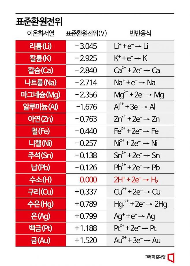 이온화 경향은 금속 물질이 전자를 잃고 양이온이 되려는 성질(산화되려는 성질)을 말한다. 과학자들은 어떤 물질의 반응성에 따라 이온화 경향을 계산해 표로 만들었다. 중·고등학교 화학시간에 외웠던 '칼칼나마알아철니주납수구수은백금'이 바로 그것이다. '칼륨(K)>칼슘(Ca)>나트륨(Na)>마그네슘(Mg)>알루미늄(Al)>아연(Zn)>철(Fe)>니켈(Ni)>주석(Sn)>납(Pb)>수소(H)>구리(Cu)>수은(Hg)>은(Ag)>백금(Pt)>금(Au)' 순서로 산화되려는 성질이 크다는 뜻이다. 수소를 중심으로 왼쪽으로 갈수록 산화되려는 성질이 강하고 오른쪽으로 갈수록 환원되려는 성질이 강하다.