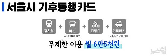 서울시가 한 달에 6만 5천 원을 내면 대중교통을 무제한으로 이용할 수 있는 카드를 만들었습니다. 내년 1월부터 4개월간 시범운영을 하고 하반기에는 본 시행을 할 예정입니다. '기후동행카드'라는 이름의 교통패스는 지하철과 시내버스, 마을버스, 공공자전거 따릉이까지 연계해 사용할 수 있습니다.