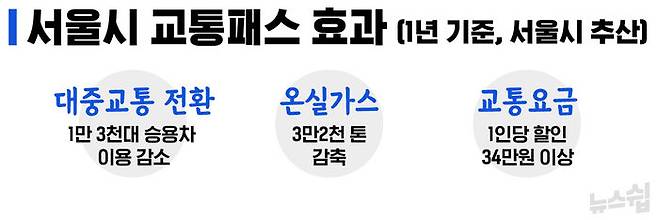 서울시는 기후동행카드 도입으로 1년 동안 승용차 이용이 1만 3천대 감소할 것으로 내다봤습니다. 온실가스를 3만 2천 톤 감축하고, 시민 한 명당 교통요금을 34만 원 이상 할인받는 효과가 있다고 봤습니다.