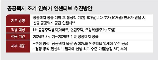인센티브 부여 대상은 기존에 보유하고 있거나 공급받을 예정인 공공택지에 대한 공급계약 체결 후 주택건설사업계획 승인을 통상적 기간(16개월)보다 앞당겨 10개월 안에 받는 사업자다. LH가 2024년 하반기부터 2026년까지 공급하는 신규 공공택지에 '추첨방식 우선 공급 참여 기회'나 '경쟁방식 평가 가점'의 인센티브를 부여받는다.