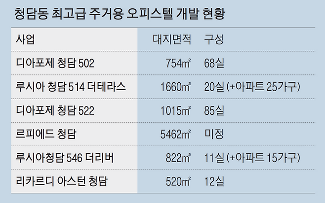 청담사거리의 ‘디아포제 청담 502’부터 ‘루시아 청담 514 더테라스’, ‘디아포제 청담 522’, ‘르피에르 청담’, ‘루시아청담 546 더리버’, ‘리카르디 아스턴 청담’ 등 6곳에 달한다. 모두 하이엔드 오피스텔을 표방하며 초고가 분양 마케팅을 펼치고 있다.