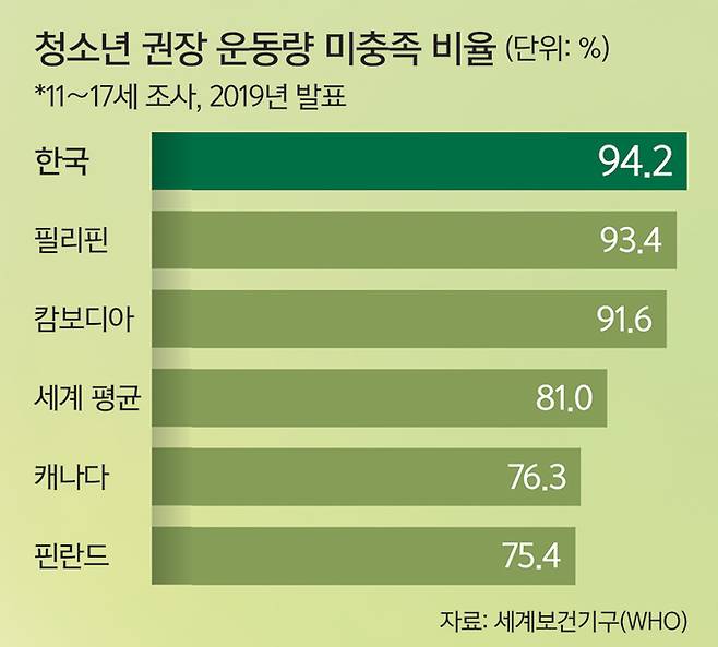 ‘매일 평균 60분 이상 중간∼격렬한 강도의 신체활동’, ‘근력·뼈 강화 운동 포함한 격렬한 운동 주 3회 이상’. 세계보건기구(WHO)가 내놓은 5∼17세 운동 권장량이다. 하지만 한국 아동·청소년 중 권장 운동량을 지키는 경우는 많지 않다. 2019년 WHO 발표 보고서에 따르면 한국 11∼17세 중 권장 운동량을 채우지 못한 비율은 94.2%로 세계 146개국(평균 81%) 중 가장 높았다. 운동 부족 비율이 90% 이상인 곳은 한국 외에 필리핀(93.4%), 캄보디아(91.6%), 수단(90.3%)뿐이었다. 통상 국가 소득 수준이 높으면 청소년 신체활동이 늘지만, 한국은 소득 수준이 높으면서도 신체활동이 적은 특이 사례로 꼽혔다.