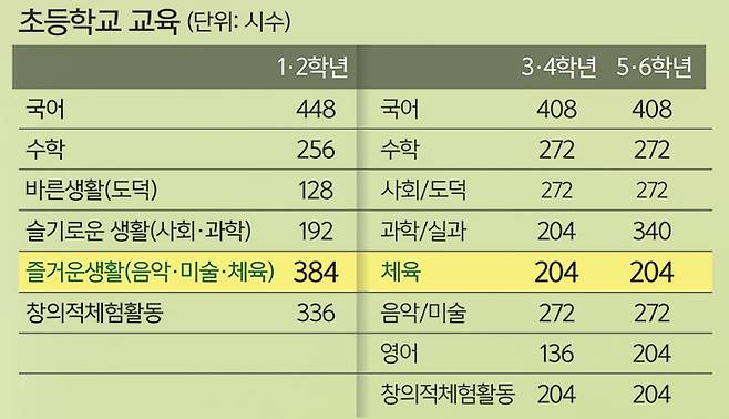 그나마 체육 수업 시간이 확보되는 것도 3학년부터다. 초 1·2학년은 40년째 음악·미술·체육이 ‘즐거운생활’ 과목으로 통합돼있다. 즐거운생활은 1학년 180시수, 2학년 204시수로만 정해져 있을 뿐, 최소 몇 시간을 신체활동에 할애해야 한다는 규정은 없다. ‘음악을 몸으로 표현해보기’식으로 음악·미술과 체육이 통합된 활동을 하는데, 수업을 어떻게 운용할지는 교사 개인의 의지와 역량에 달렸다.
