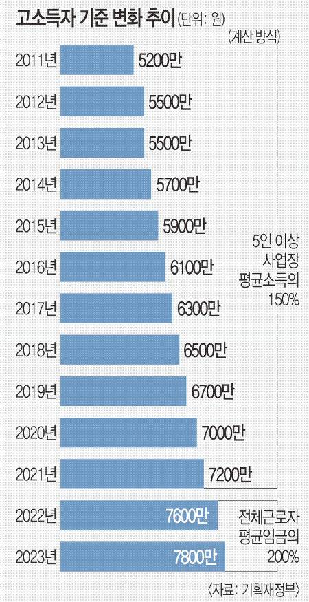 다만 기준을 변경한 후에도 기재부의 고소득자 기준은 그동안의 상승 추세를 벗어나지 않는 모습이다. 2011년 5200만원이었던 기준 소득은 매년 200만~300만원씩 상향을 거듭해 2021년에는 7200만원까지 올랐다. 오히려 기준을 바꾼 지난해는 7600만원, 올해는 7800만원으로 이전보다 더 증가했다. 중위소득으로 계산하는 OECD식 대신 평균임금 기반의 독자 계산식을 고집한 결과다. 이상민 나라살림연구소 연구위원은 “평균소득의 200%라는 기준을 적용하는 곳은 오로지 한국 기재부뿐”이라며 “기준이 갑자기 바뀌면서 연도별 비교 기능도 사실상 어려워졌다”고 지적했다.