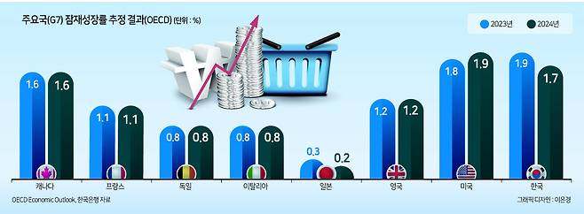 내년엔 우리나라 잠재성장률이 G7 중 하나인 미국 보다도 낮아지는 것으로, 이는 OECD의 2001년 이후 24년간 추정치 통계에서 처음 있는 일이다.