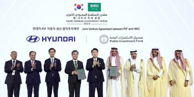 계약 체결식에는 정의선 현대차그룹 회장, 장재훈 현대차 사장, 야시르 오스만 알루마이얀 PIF 총재, 야지드 알후미에드 PIF 부총재 등이 참석했다. 내년 상반기 착공해 2026년 상반기 양산이 목표다. 연간 5만대를 생산할 수 있는 규모로 짓는다. 내연기관차뿐만 아니라 전기차까지 생산할 수 있는 설비를 갖출 계획이다. 현대차와 PIF는 합작공장 건설에 5억 달러 이상을 공동 투자한다. 지분은 현대차가 30%, PIF가 70% 보유하기로 했다.