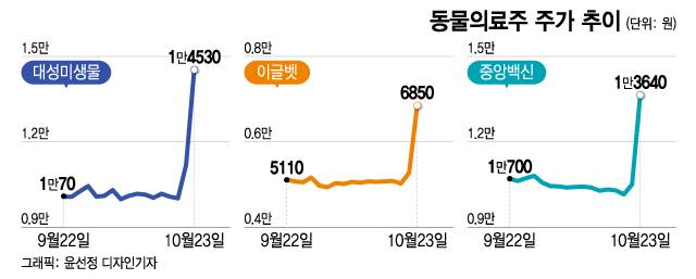 럼피스킨병 확진 사례가 이어지자 가축용 항생제, 소독약 등의 수요가 늘 것이라는 기대감에서 비롯된 것으로 풀이된다.