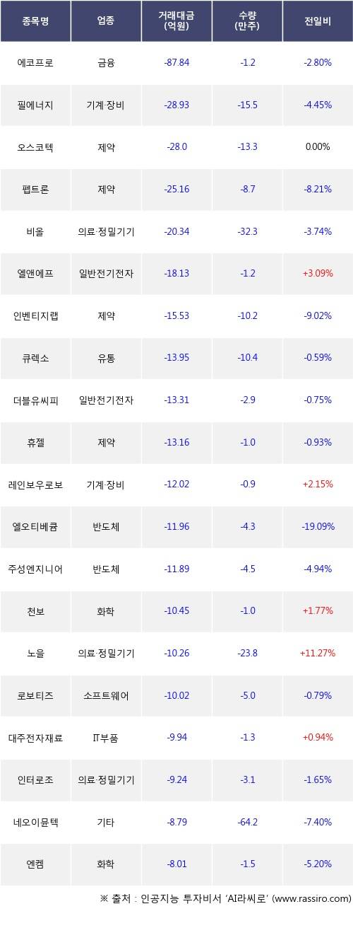 기관 투자자의 순매도 상위 20개 종목은 에코프로, 필에너지, 오스코텍, 펩트론, 비올, 엘앤에프, 인벤티지랩, 큐렉소, 더블유씨피, 휴젤등이다.