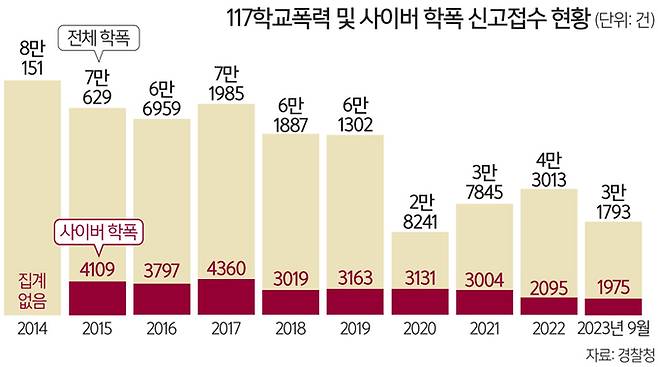 23일 경찰에 따르면 지난해 접수된 117학폭 신고는 4만3013건이었다. 이 중 사이버학폭 관련 사건은 2095건이었다. 코로나19 발생 후 2020년 급감했던 전체 학폭 신고접수 현황은 올해까지 다시 꾸준한 증가세다. 사이버학폭의 경우에는 2015년부터 신고접수 현황을 관리한 이래 연도별 차이가 미미할 만큼 학폭에서 차지하는 비중이 높다. 2021년까지 3000건대에서 지난해 2095건으로 감소했으나 올해는 지난달까지 1975건이 접수되며 지난해와 비슷한 수준이다.