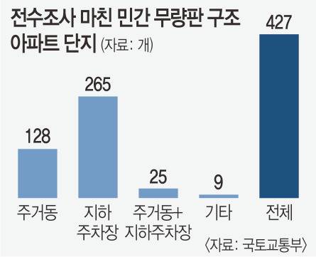 국토교통부가 2개월간 전국 427개 무량판 구조 아파트 단지를 조사한 결과, 철근이 빠지거나 콘크리트 강도가 낮은 곳은 없는 것으로 나타났다.