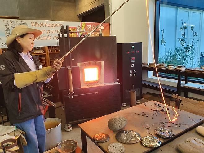 | ▲ 용암으로 되돌아간 현무암 현무암을 섭씨 1300도로 가열하면 본래의 용암 상태로 변하고, 이를 서서히 식히면 제주 특유의 기념품을 만들 수 있다. |