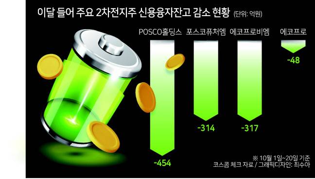 개인투자자들의 수급이 집중됐던 포스코그룹주와 에코프로그룹주의 신용융자잔고는 이달 들어 1200억원 넘게 빠진 것으로 나타났다.