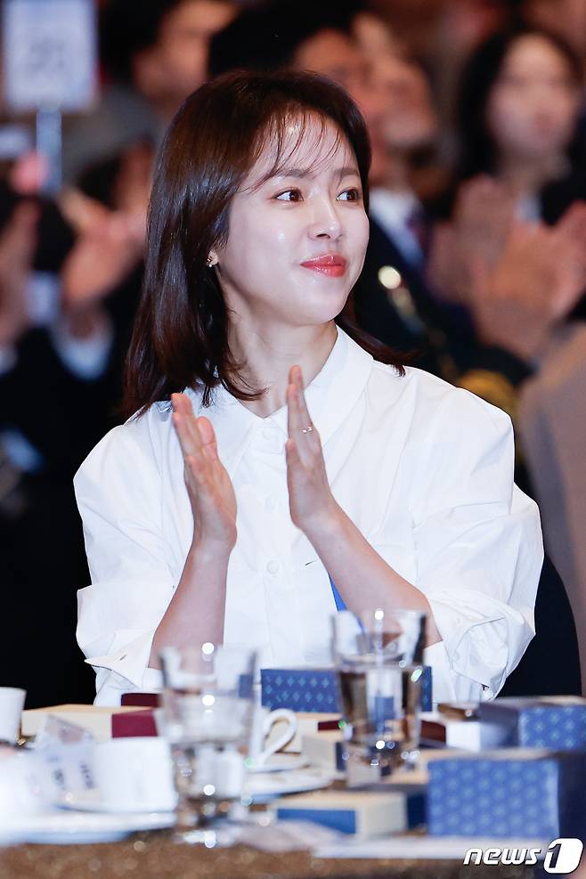 (서울=뉴스1) 안은나 기자 = 배우 한지민이 24일 서울 영등포구 63컨벤션에서 열린 제8회 금융의 날 기념식에 참석해 손뼉치고 있다. 2023.10.24/뉴스1
