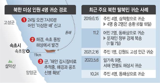 24일 강원 속초 앞바다에서 북한 주민으로 추정되는 4명이 탄 목선을 발견한 것은 ‘이상한 배가 있다’는 한 어민의 신고에서부터 비롯됐다. 군 당국이 ‘특이 징후를 포착하고 있었다’고 밝힌 가운데, 감시·경계 태세가 적절했는지 여부가 향후 논란이 될 가능성이 있다. 해상 탈북은 2019년 탈북 어민 강제북송 등의 영향으로 그간 잠잠했지만, 윤석열 정부 출범 후 지난 5월 서해 상 일가족 귀순에 이어 다시 늘어날 조짐을 보이고 있다.