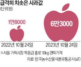 이처럼 사과 가격이 급등한 건 생산량이 줄어서다. 사과는 봄철 개화 시기가 한 해 농사를 결정지을 만큼 중요하다. 그런데 올해는 3월부터 이상 고온이 나타나면서 사과꽃이 일찍 피었다. 이후 기온이 다시 급락하면서 냉해 피해를 본 농가가 증가했고, 그 결과 지난 6월 나무에 사과 열매가 남은 ‘착과수’는 1년 전보다 16% 줄었다. 여기에 여름철 집중호우, 농가를 덮친 탄저병 등 ‘악재’도 겹쳤다. 올해 사과 생산량은 43만5000t으로 전년(56만6000t)보다 23% 감소할 것으로 전망된다.