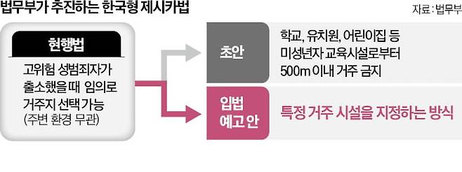 법무부는 당초 검토한 초·중·고교, 유치원, 어린이집 등 미성년자 교육시설로부터 500m 이내 지역의 거주를 금지하는 방식은 도입하지 않기로 했다. 이 기준을 적용하면 인구 밀집도와 교육시설 분포 현황 등을 고려했을 때 수도권을 비롯한 주요 대도시에선 고위험 성범죄자의 거주가 사실상 불가능하기 때문이다. 서울시의 초·중·고교, 유치원, 어린이집만 해도 8000여 개(지난해 말 기준)로, 이들 간 평균 간격은 약 300m에 불과하다. 고위험 성범죄자 거주지 부족뿐만 아니라 도시 외곽 지역에 대한 차별 논란 가능성도 고려했다는 게 법무부의 설명이다.