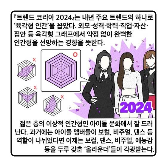 최근 인터넷에는 ‘육각형 연예인’ ‘육각형 남친’ ‘육각형 스트라이커’ 같은 표현이 자주 등장한다. 뭐 하나 빠질 것 없이 여러 조건을 두루 갖춘 완성형이라는 의미다. 서울대 소비자학과 김난도 교수팀의 『트렌드 코리아 2024』는 내년 주요 트렌드의 하나로 ‘육각형 인간’을 꼽았다. 외모·성격·학력· 직업·자산·집안 등 육각형 그래프에서 약점 없이 완벽한 인간형을 선망하는 경향을 뜻한다. 특히 집안이나 성형하지 않은 외모 등 노력으로 되지 않는 ‘타고난’ 자질을 높이 평가한다는 데 특징이 있다. 책에 따르면 2000년대 초 미국 대학가에서 많이 쓰였다는 ‘아무 노력 없이도 완벽한(effortlessly perfect)’이란 표현 그대로다.