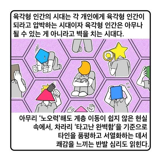 육각형 인간의 시대는 각 개인에게 육각형 인간이 되라고 압박하는 시대이자 육각형 인간은 아무나 될 수 있는 게 아니라고 벽을 치는 시대다. 아무리 ‘노오력’해도 계층 이동이 쉽지 않은 현실 속에서, 차라리 ‘타고난 완벽함’을 기준으로 타인을 품평하고 서열화하는 데서 쾌감을 느끼는 반발 심리도 읽힌다. 이제는 아이돌 팬들도 좋아하는 팀을 1군, 2군 등으로 등급화해 부르는 것에 익숙하다.