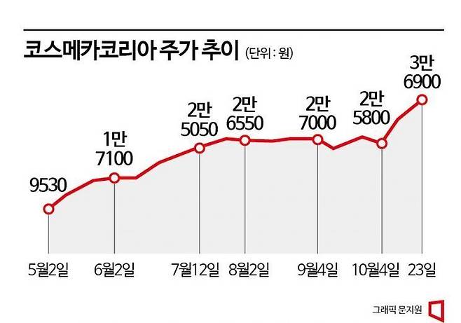 코스메카코리아는 23일 전거래일 대비 1750원(4.98%) 오른 3만6900원에 마감했다. 종가 기준 연중 최고가다. 직전달 대비 35.16% 상승했다. 지난해 말 대비로는 260% 급등했다. 지난달 말 대비 코스닥 지수가 9.19% 하락, 코스닥 화학 지수가 7.70% 밀린 것 대비 양호한 수익률이다.