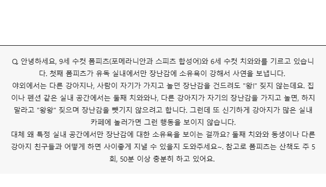A. 안녕하세요. 반려동물과 반려인의 행복하고 편안한 공존을 돕는 비강압식 트레이너 김민희입니다. 이번 사연은 많은 반려견에게 흔히 보이는 행동 이슈인 장난감에 대한 소유욕인데요. 폼피츠 친구의 소유욕이 왜 발생했는지, 다른 강아지 친구들과도 사이좋게 지낼 방법이 있는지 함께 알아보겠습니다.