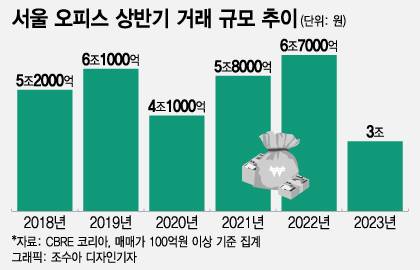 24일 부동산 서비스 기업 CBRE코리아에 따르면 올해 상반기 서울 소재 오피스 100억원 이상의 거래를 조사한 결과 거래 금액은 3조원을 소폭 상회했다. 이는 상반기 기준으로 최근 5년 내 최저 수준이다. 코로나19 확산으로 시장 환경이 안 좋았던 2020년 상반기 보다 저조하다.