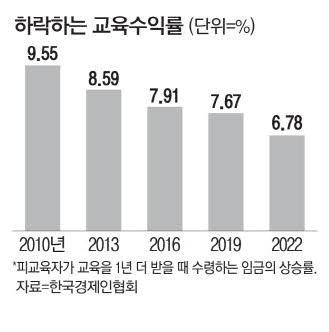 교육비는 급증하지만 투자 효과는 갈수록 떨어지고 있다. 25일 매일경제와 한국경제인협회가 공동 분석한 바에 따르면 교육비의 효율성을 측정하는 한국의 교육수익률이 최근 10년간 크게 하락한 것으로 나타났다. 2010년 9.55%였던 교육수익률은 지난해 6.78%로 뚝 떨어지면서 3분의 2 수준으로 내려앉았다. 교육수익률은 피교육자의 연령·소득·교육기간 등을 회귀 분석해 추정한 수익률이다. 피교육자가 교육을 1년 더 받을 때 수령하는 임금의 상승률을 의미한다.